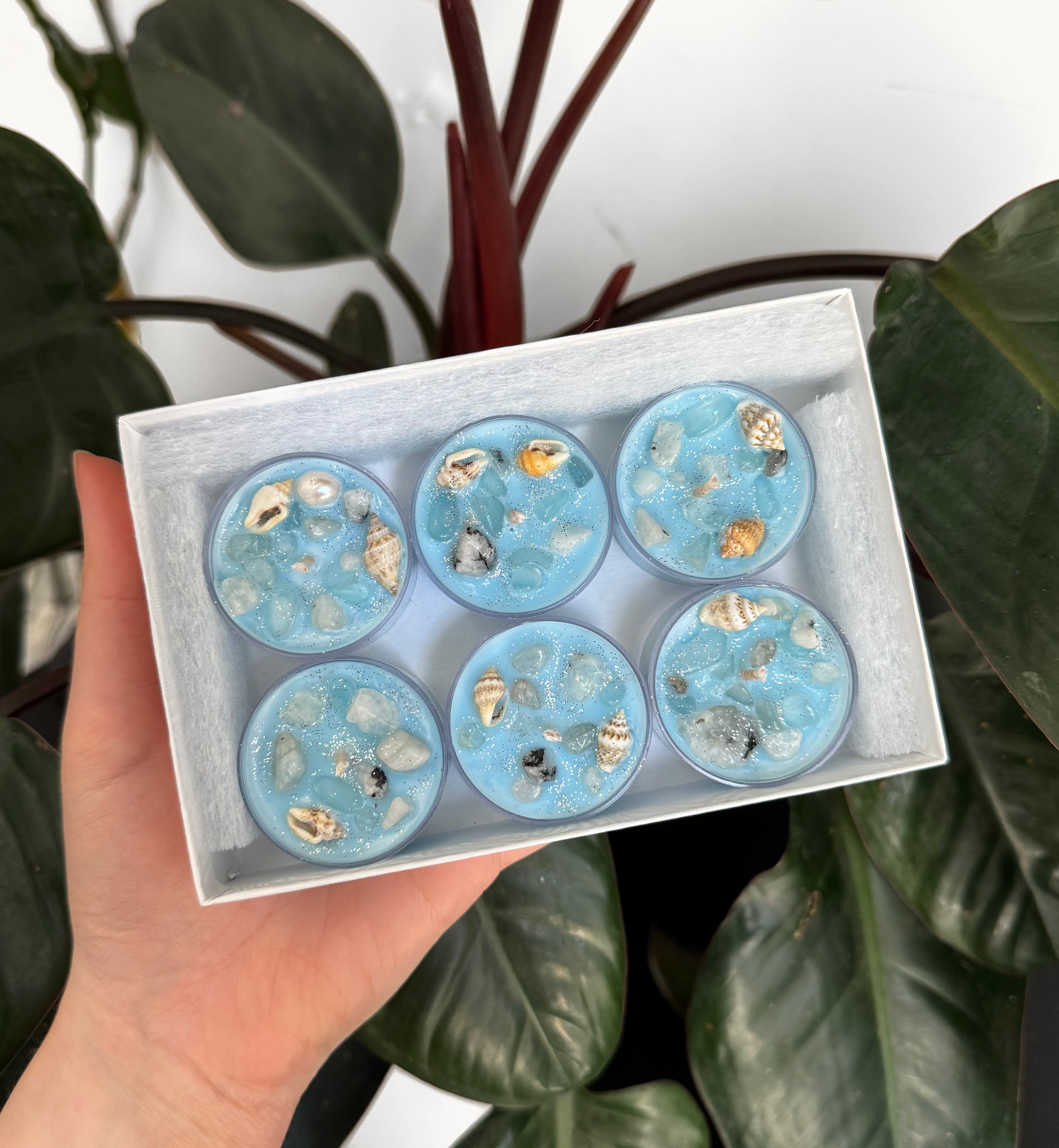 This set comes with 6 soy wax tealight candles that are crafted with aquamarine, rainbow moonstone and seashells. These candles can be used for a devotional offering to Amphitrite, spell work, or manifesting intentions around processing emotions, heightening intuition, and embodying divine feminine energy.