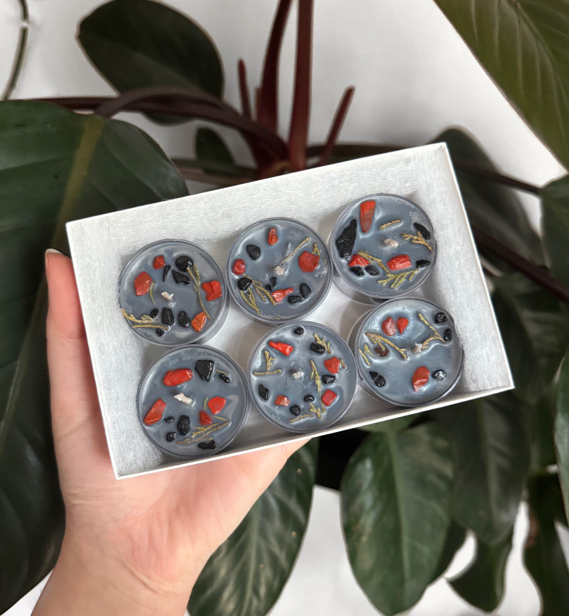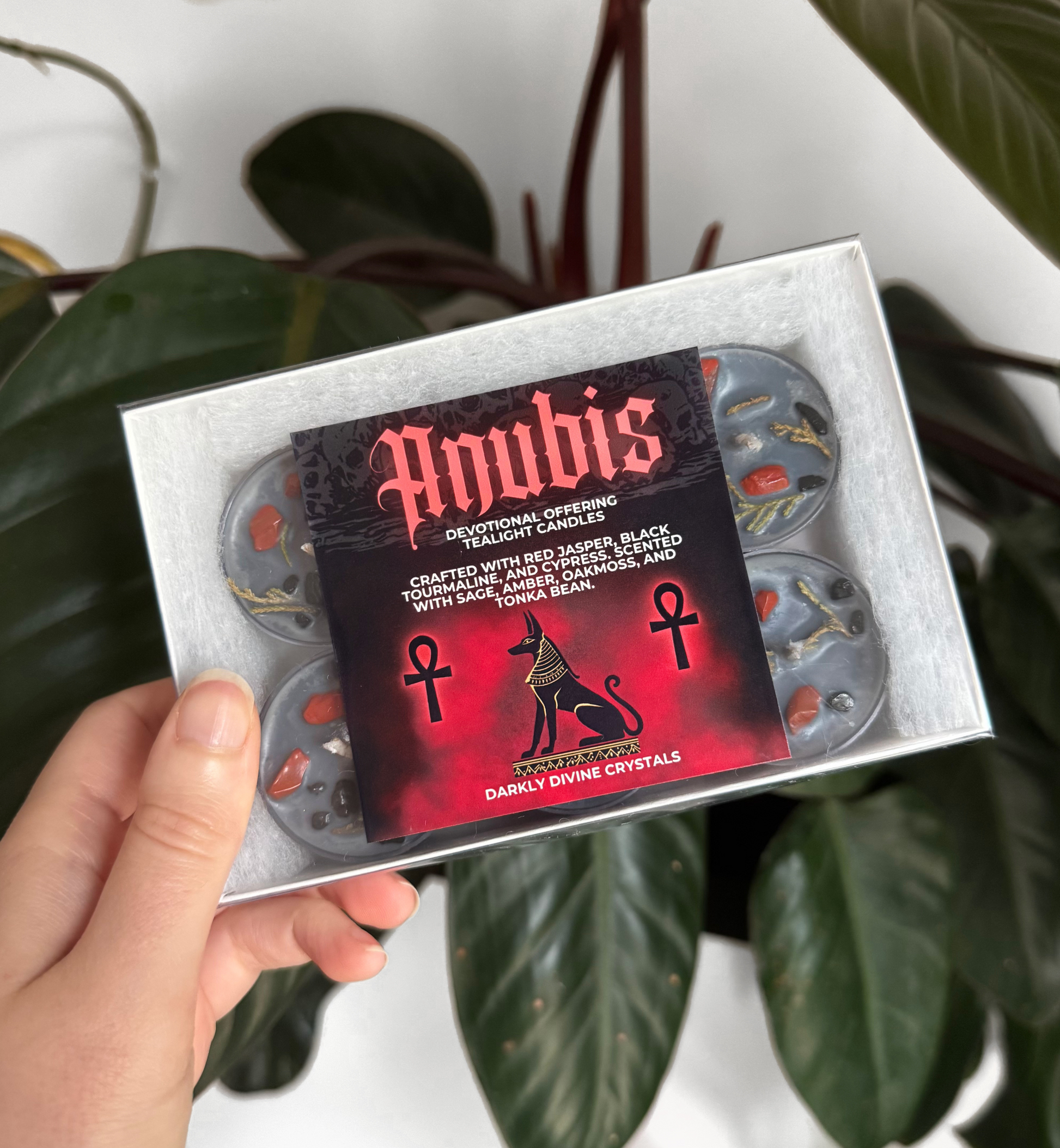This set comes with 6 soy wax tealight candles that are crafted with red jasper, black tourmaline, and cypress. These candles can be used for a devotional offering to Anubis, spell work, or manifesting intentions around protection, warding, and grounding.