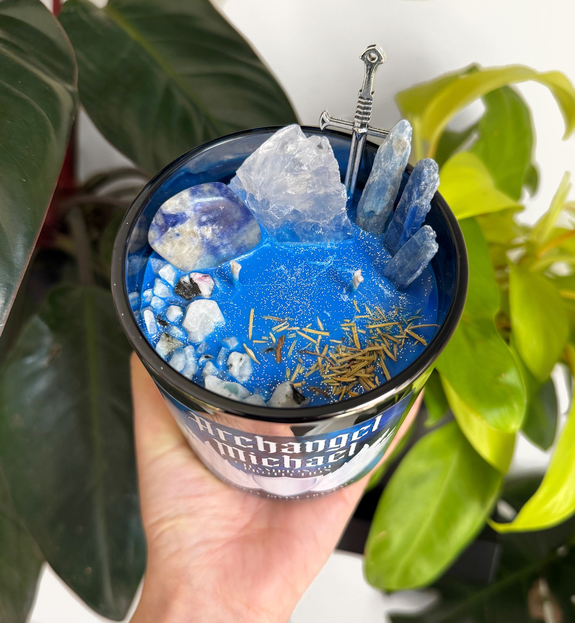 Our Archangel Michael candle is created from 100% natural soy wax and is hand poured into silver glass jars. Sprinkled with rosemary for energetic protection, this candle includes: