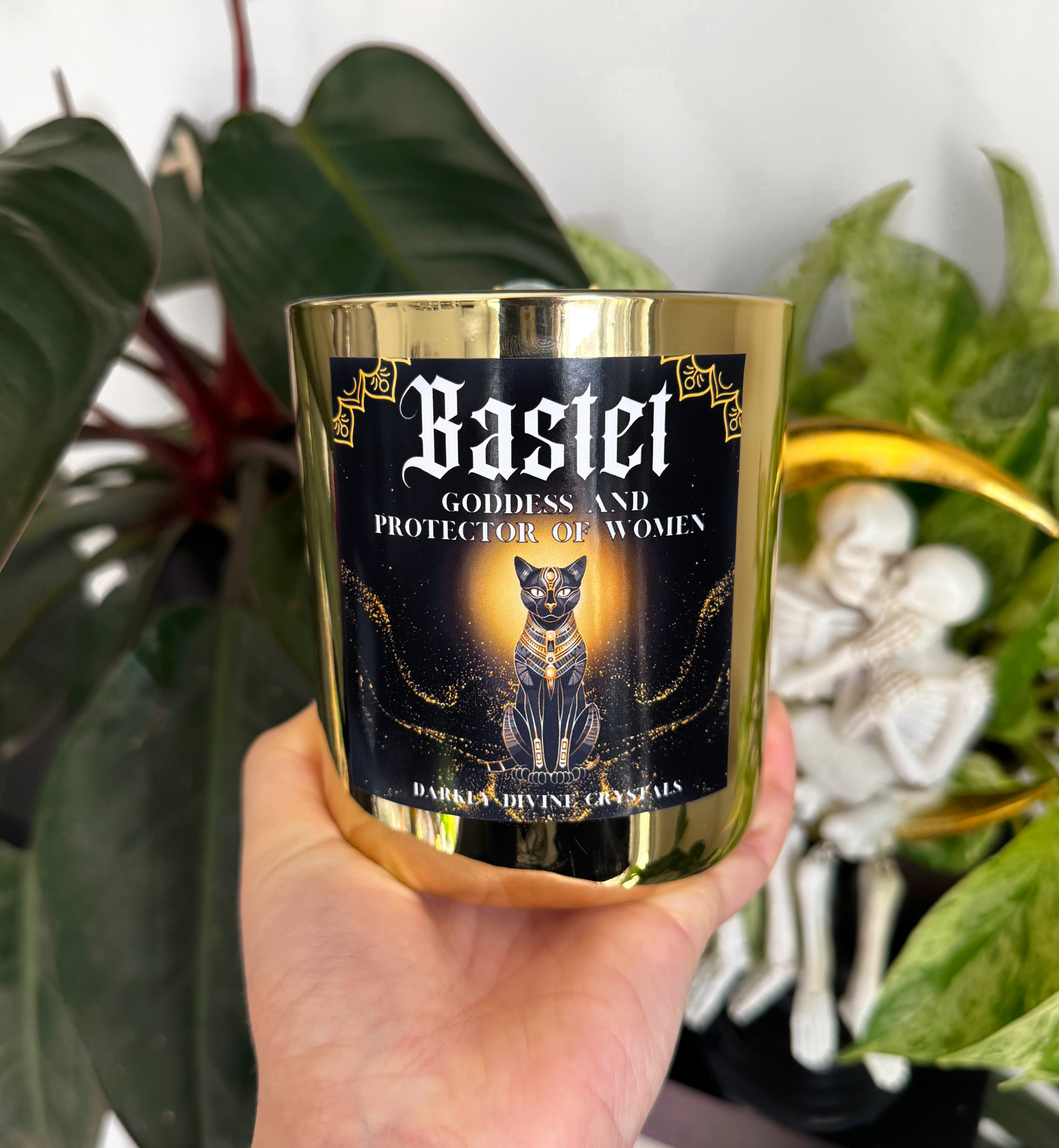 Our Bastet candle is created from 100% natural soy wax and is hand poured into gold glass jars. Sprinkled with vervain and catnip to honor Bastet's ties to her feline form, this candle includes:
