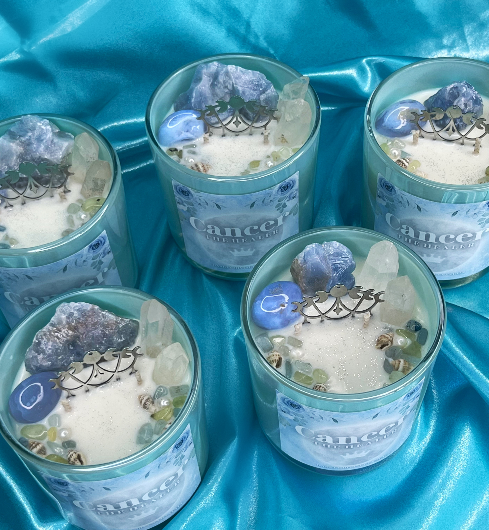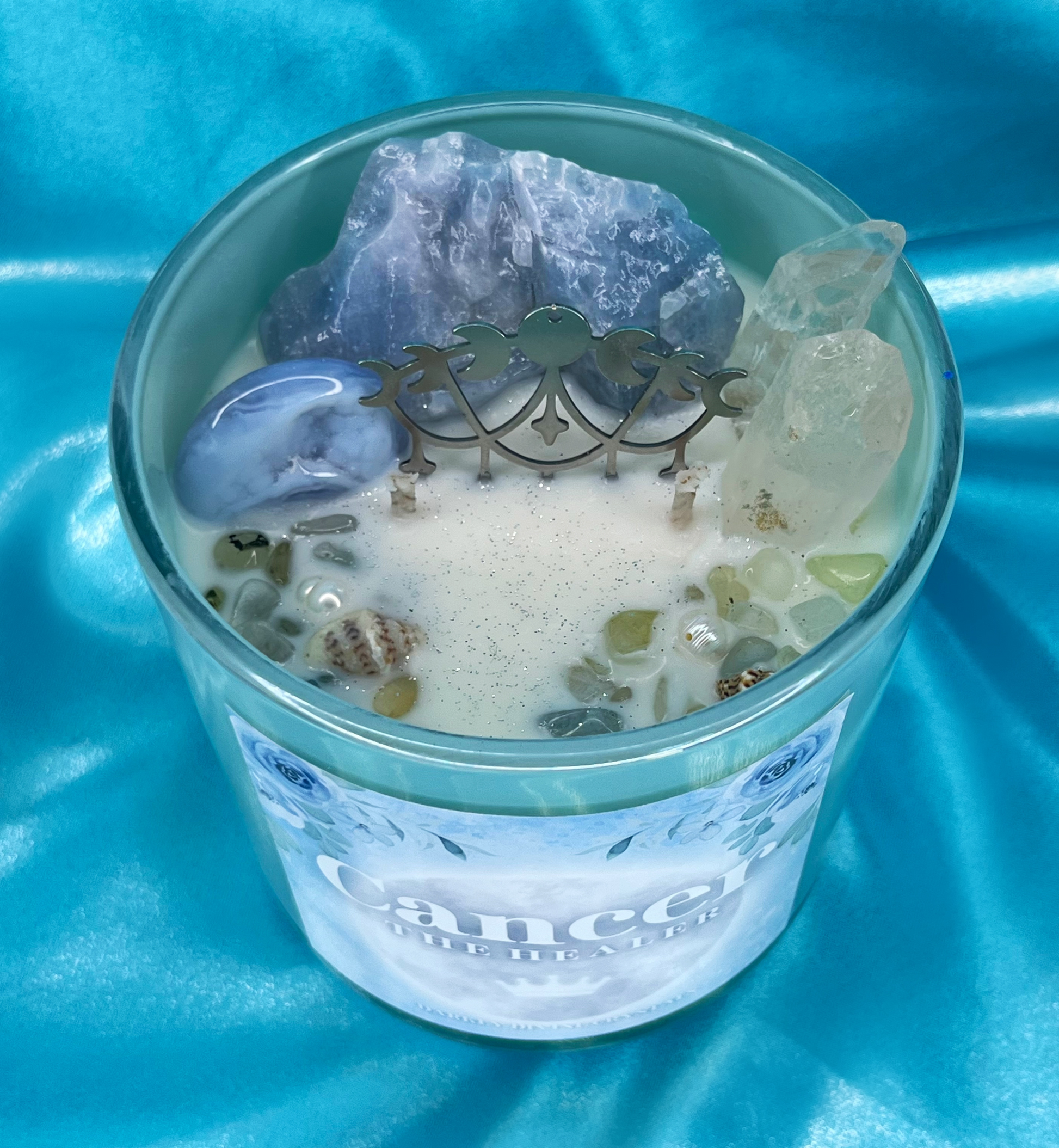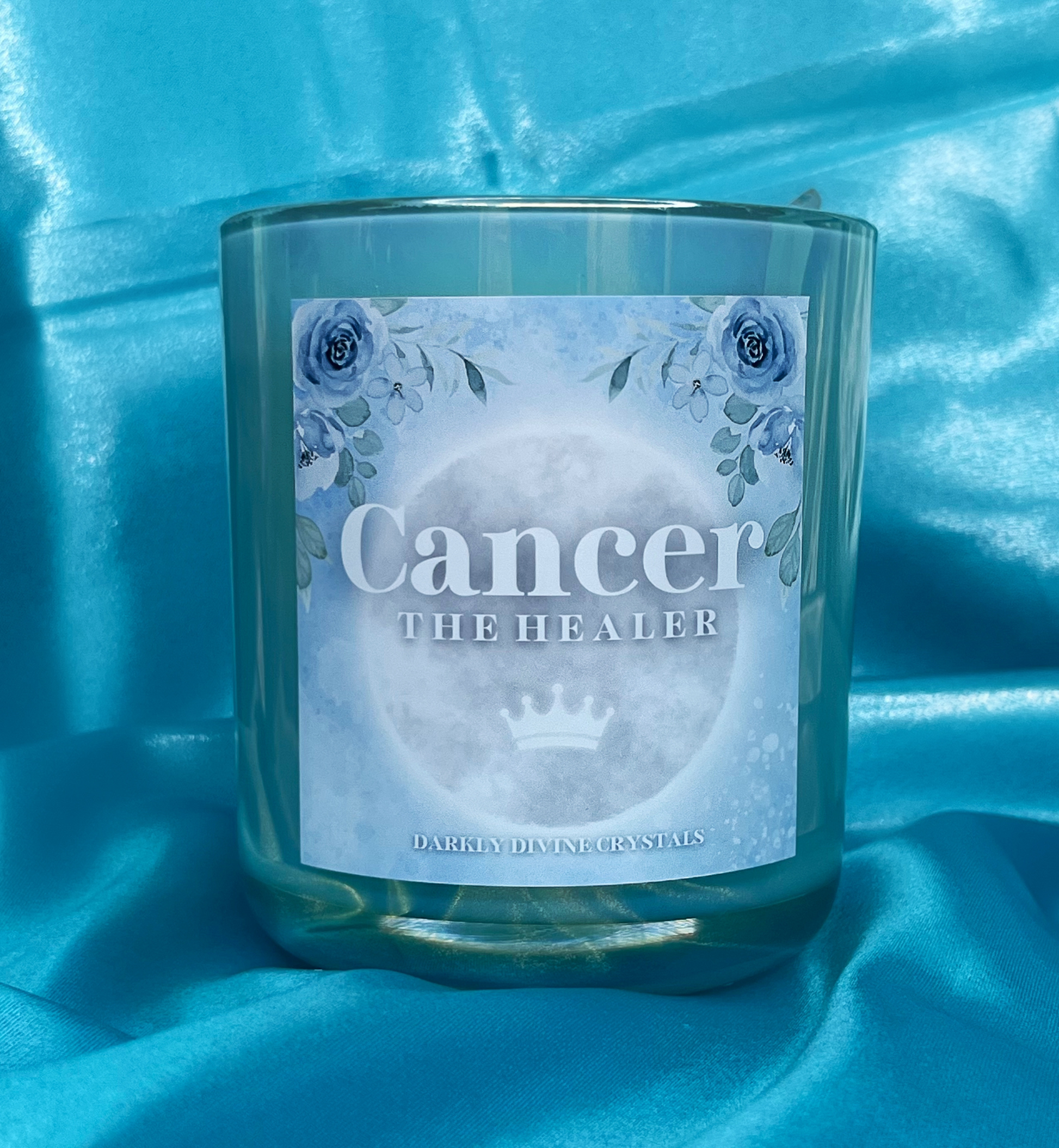 Ruled by the moon and in tune with the depths of emotion, Cancer is the nourishing healer of our zodiac collection. This candle is created from 100% natural soy wax and is hand poured into iridescent light blue glass jars.