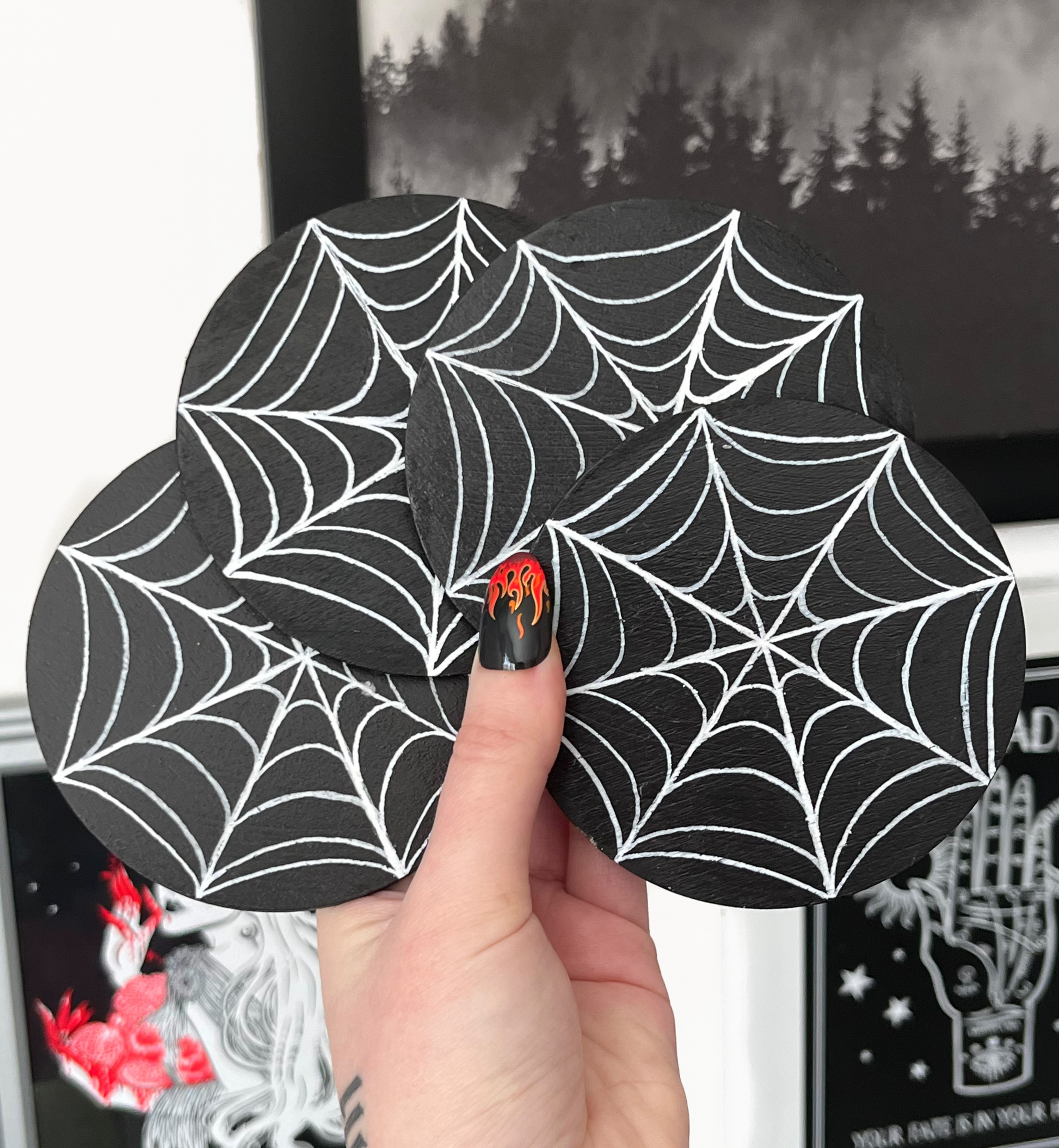 This set comes with 4 hand painted wooden spider web coasters that are perfect for holding drinks, displaying crystals, enchanting jewelry or adorning your altar space.