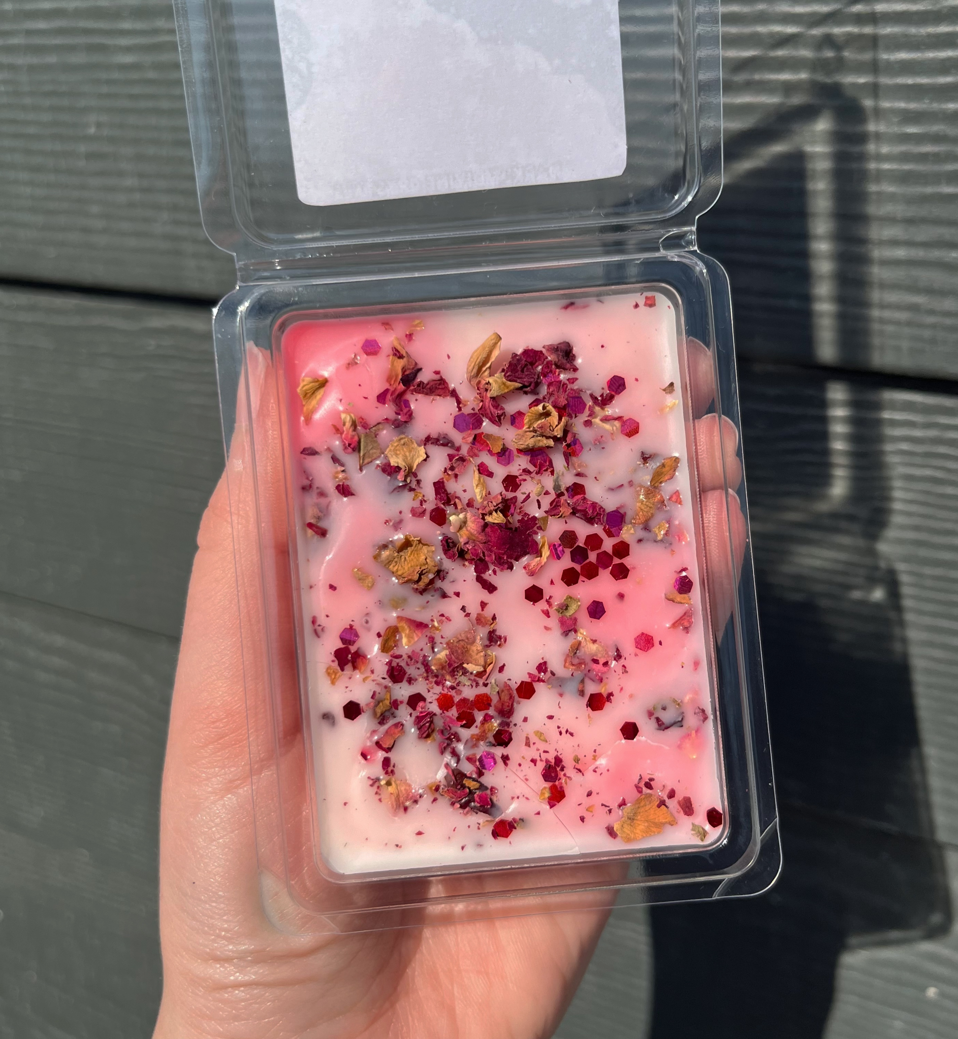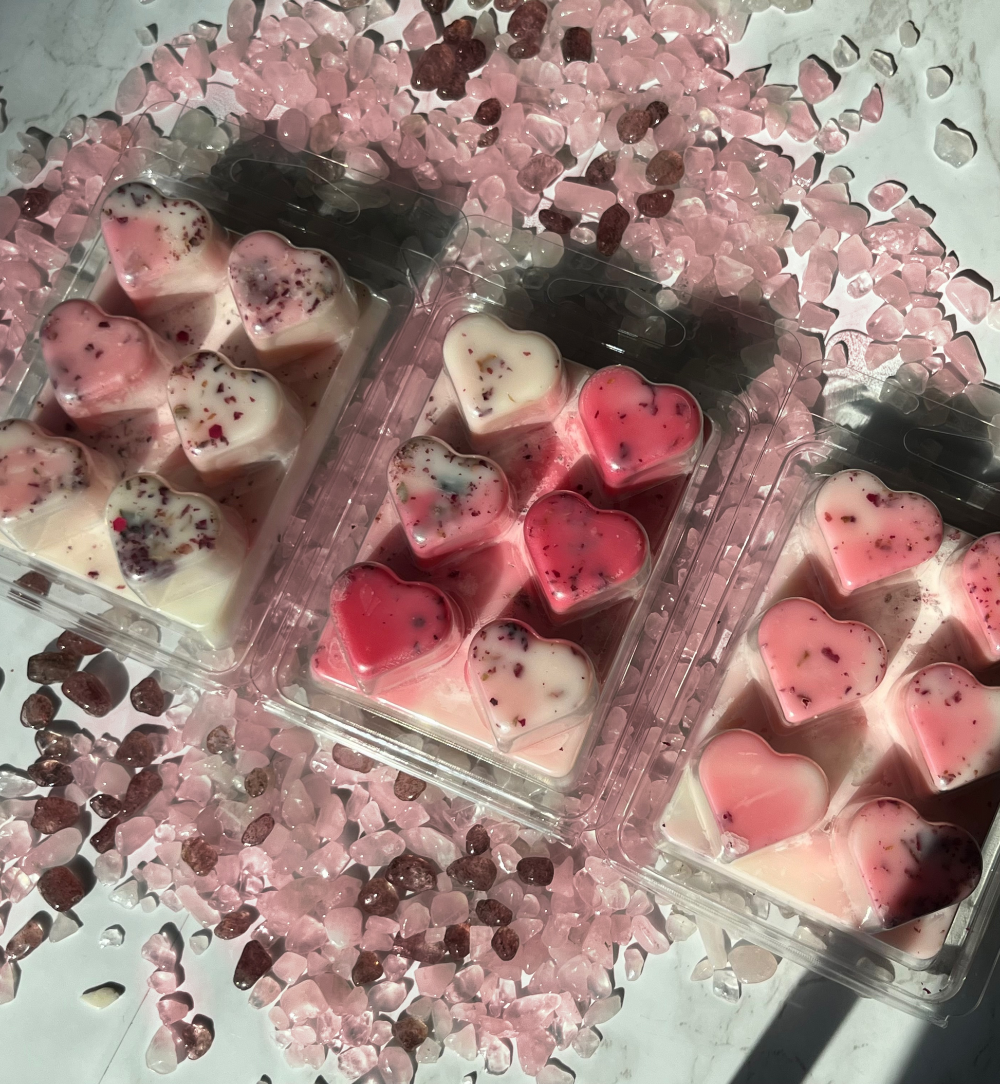 Spelled for enhancing self love, allure, romance, and attraction, these 100% soy heart wax melts include: